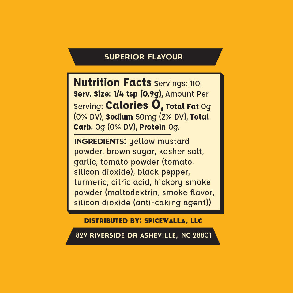 Ingredients: Yellow Mustard Powder, Brown Sugar, Kosher Salt, Garlic, Tomato Powder (tomato, silicon dioxide), Black Pepper, Turmeric, Citric Acid, Hickory Smoke Powder (Maltodextrin, smoke flavor, silicon dioxide (anti-caking agent))