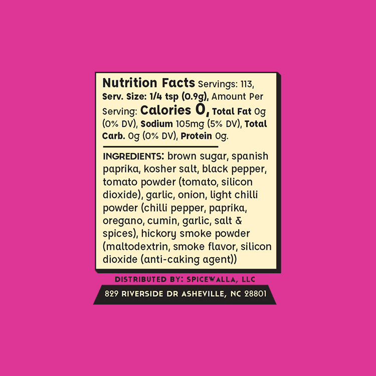 Ingredients: Brown Sugar, Spanish Paprika, Salt, Black Pepper, Tomato Powder, Garlic, Onion, Light Chilli Powder, Hickory Smoke Powder