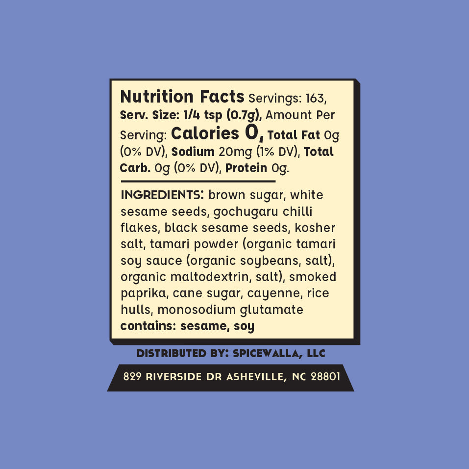 Ingredients: brown sugar, white sesame seeds, gochugaru chilli flakes, black sesame seeds, kosher salt, tamari powder (organic tamari soy sauce (organic soybeans, salt), organic maltodextrin, salt), smoked paprika, cane sugar, cayenne, rice hulls, monosodium glutamate