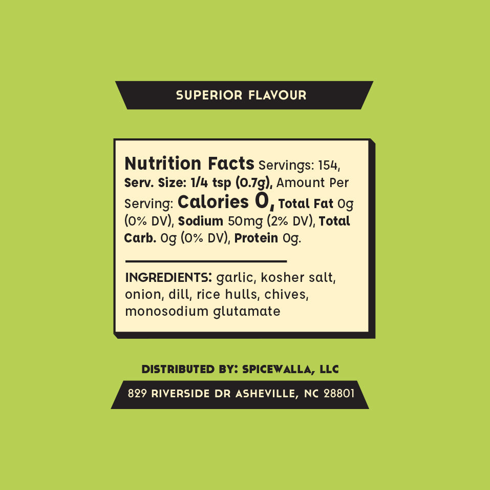 Ingredients: Garlic, Kosher Salt, Onion, Dill, Rice Hulls, Chives, Monosodium Glutamate