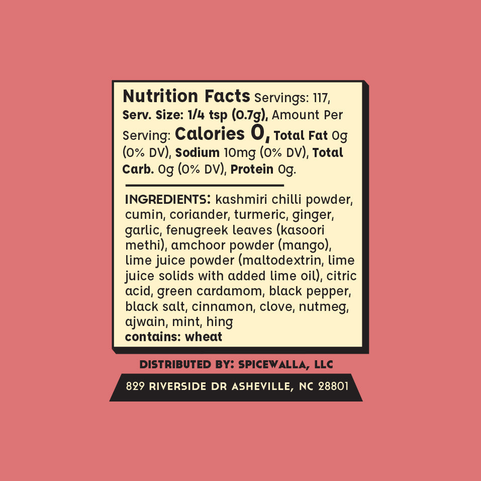 Ingredients: Kashmiri Chilli Powder, Cumin, Coriander, Turmeric, Ginger, Garlic, Fenugreek Leaves (Kasoori Methi), Amchoor Powder (Mango), Lime Juice Powder (Maltodextrin, Lime Juice Solids with added Lime Oil), Citric Acid, Green Cardamom, Black Pepper, Black Salt, Cinnamon, Clove, Nutmeg, Ajwain, Mint, Hing
